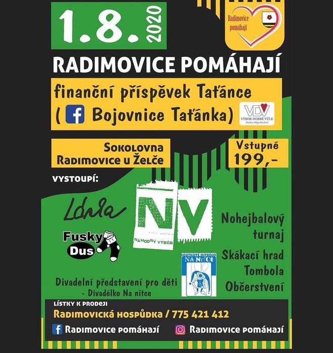 Letos v druhém ročníku se vybíralo na čtyřletou Taťánku. (její životní příběh a pozvánku můžete shlédnout po kliknutí na obrázek) Začalo se v 8:00 hod. nohejbalovým turnajem O POHÁR JIRKY LUTOVSKÉHO odpoledne hrálo divadlo na nitce pohádku ŠVEC A ČERT a na závěr večer během hudební produkce byly vyhlášeny výsledky nohejbalového turnaje. Zvítězilo družstvo DRAŽIC a obhájilo tak loňské prvenství a putovní pohár JIRKY LUTOVSKÉHO.