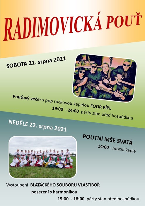 pouťový večer s pop rockovou kapelou FOOR PÍPL v neděli odpoledne POUTNÍ MŠE SVATÁ a v podvečer vystoupení