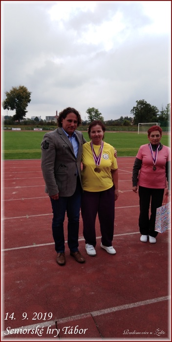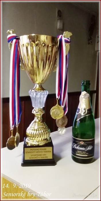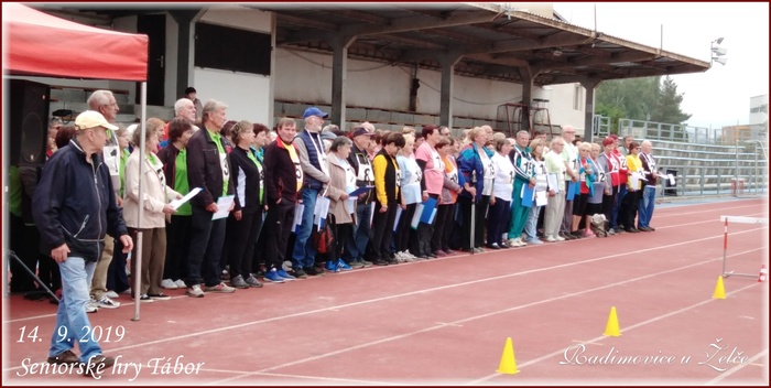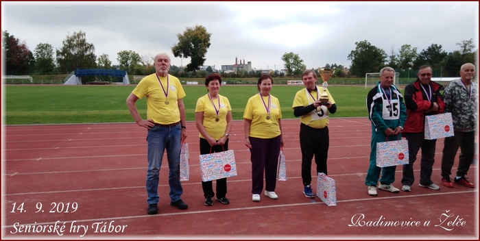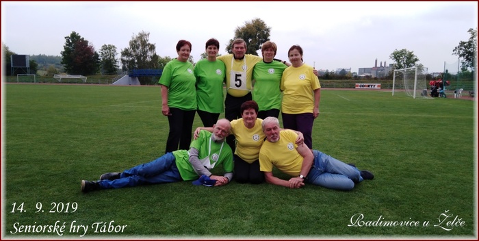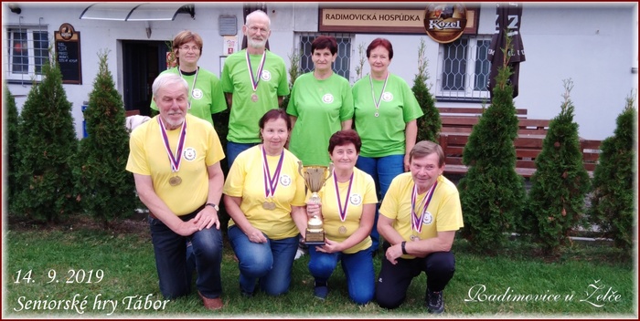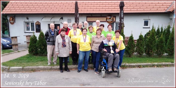 Naše dvě družstva se zúčastnila druhého ročníku Sportovních her seniorů o Putovní pohár starosty města Tábora v úterý 24. září 2019. 1. družstvo ,,Ajčaboys" ve složení (V. Drtina, Z. Vokurková, M. Amentová a J. Machoň) a 2. družstvo "Radimovičáci" ve složení (J. Semian, H. Semianová, L. Mládková a J. Drtinová). Soutěžilo se v osmi disciplínách a s pětadvaceti zúčastněných družstev naše 1. družstvo zvítězilo a přivezlo domů putovní pohár. V jednotlivcích získala M. Amentová 1. místo v kategorii do 70. let a v té samé kategorii obsadili první tři místa naši muži 1. V. Drtina 2. J. Machoň a 3. J. Semian. Vše podstatné je zachyceno na přiložených fotografiích.