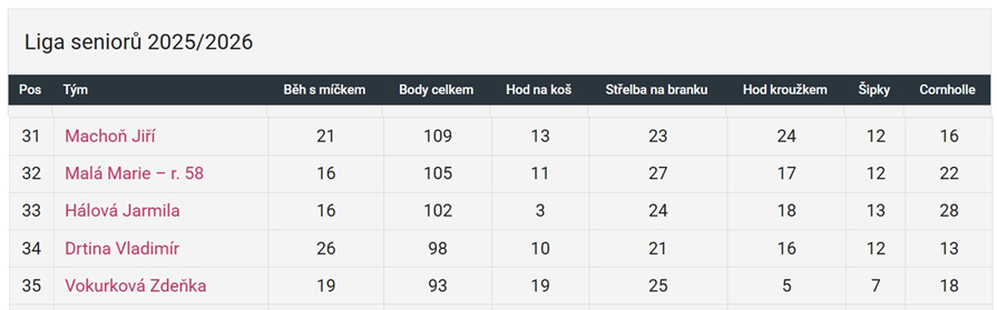 Naše družstvo seniorů se stále zúčastňuje soutěží Sportovní ligy seniorů 2025/26 a drží si velice vyrovnané umístění na předních místech (31,32,33,34 viz tabulka, z 345 účastníků) pod odkazem naleznete kompletní informace včetně fotografií.