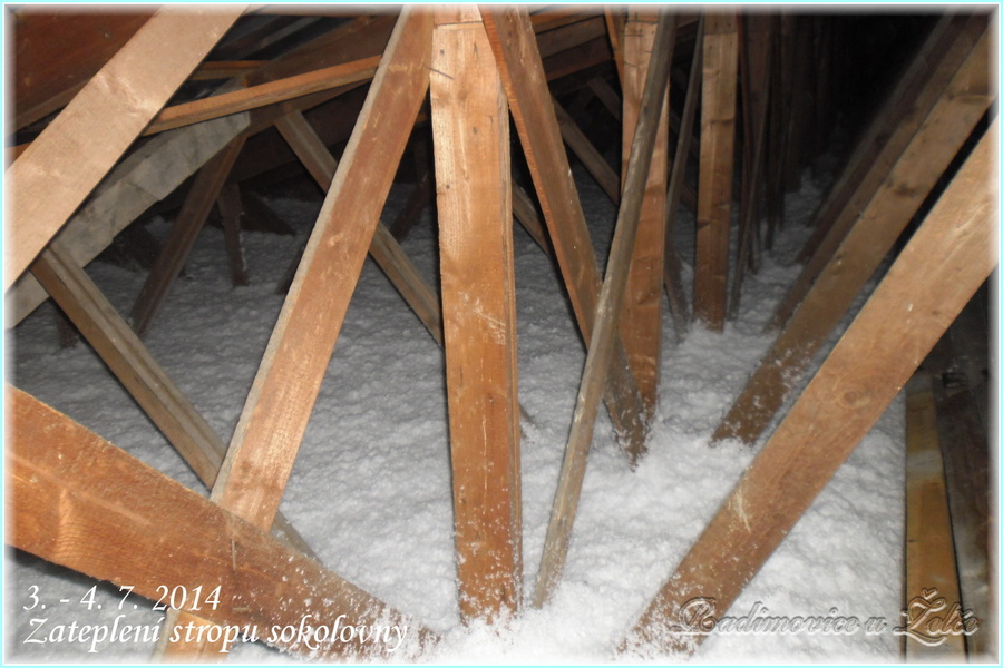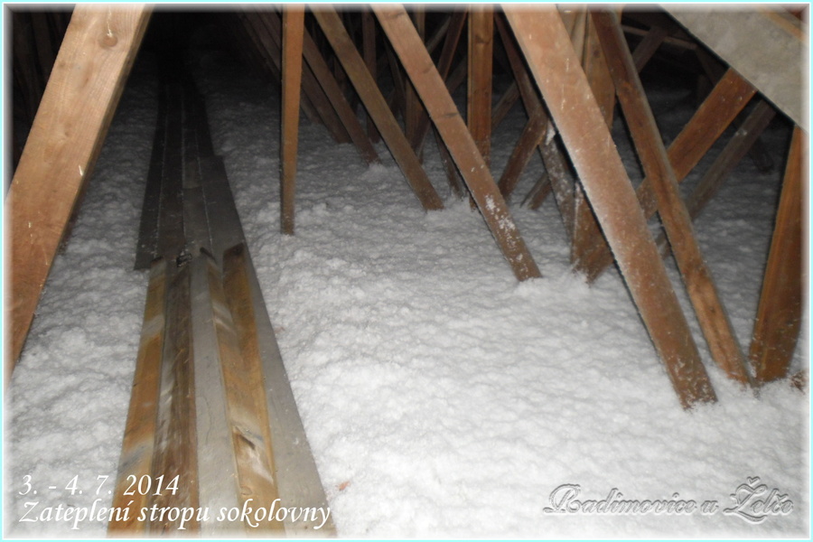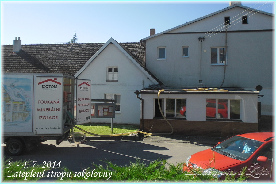 Během dvou dnů (3. a 4. července 2014) provedla firma IZOTOM zateplení stropu sokolovny foukanou minerální izolací.